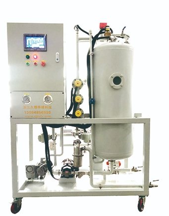 根据水和油的沸点不同原理而设计的,它由真空加热罐精滤罐、冷凝器、初滤器、水箱、真空泵、排油泵以及电气柜组成。真空泵将真空罐内的空气抽出形成真空,外界油液在大气压的作用下,经过入口管道进入初滤器,清除较大的颗粒,然后进入加热罐内,经过加热45~85℃的油通过自动油漂阀,此阀是自动控制进入真空罐内的油量进出平衡。