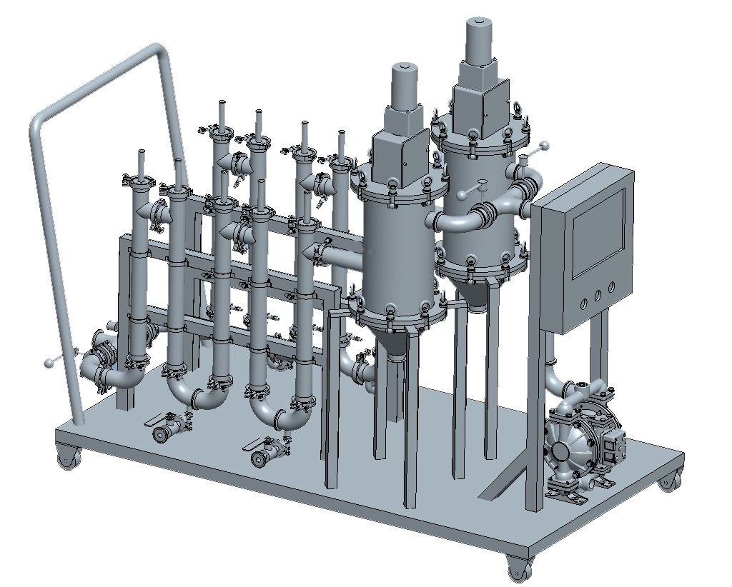 在电池浆料输送过程中,电池浆料先经过过滤器,把电池浆料里的体悬浮物、颗粒物,等杂质过滤掉,然后经过U型除铁小车过滤器时,受强力磁棒的磁性作用,浆料中的铁杂质被多级的强力磁棒吸附在套管上,大大减少电池浆料中的铁离子