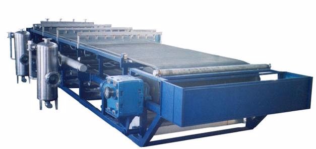 真空皮带脱水机,又称橡胶带式真空过滤机,是环形胶带拖动滤布在真空箱上滑动,可实现连续抽真空,避免了真空箱移动式过滤机的真空切换环节,故从进料、过滤、洗涤、脱水、卸料到滤布的清洗再生,整个过程实现了连续作业,因而其生产能力大、过滤速度高、洗涤效果好、滤饼含湿量低。同时,胶带速度、进料量、料浆浓度、洗涤水量、真空度、洗涤区和干燥区均可根据生产需要选择理想参数。该机型易损件少,故障率低,可实现长周期连续运转、运行平稳、操作简便、劳动强度低。