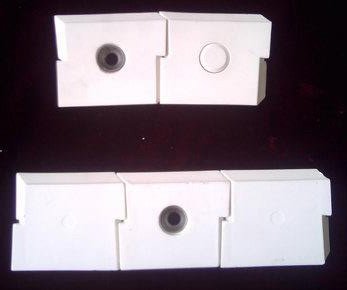 焊接型互压耐磨陶瓷是用耐高温强力粘胶将中间带孔的氧化铝陶瓷片粘贴在管道内壁,同时配合钢碗与钢板焊接工艺透过小孔将陶瓷牢固地焊接在金属基体上。为保护焊点,上面再旋上陶瓷盖帽。每块瓷片不但互压互插,而且每块瓷都有正、反梯形角度,使瓷块之间紧密连接,无缝隙。