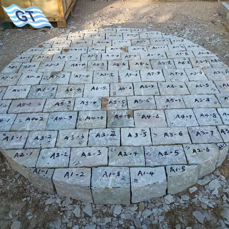 初加工衬石为尺寸、厚度大致相同的长方形硅石块,需要到厂后进行二次加工磨头,再进行安装。