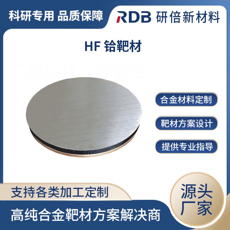 Hf(铪)靶材是一种用于物理蒸发沉积和物理气相沉积的材料,通常用于制备薄膜和涂层。铪靶材具有良好的化学稳定性和热稳定性,可用于制备具有高熔点和高热稳定性的材料。它在半导体、光学涂层、太阳能电池和其他电子器件的制备中具有广泛的应用。铪靶材通常以圆盘或矩形形式供应,可根据客户的需求进行定制加工。