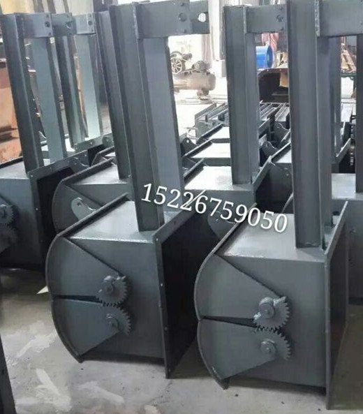 腭式闸门由本体、扇形闸板、轴、齿轮、密封件、执行机构等部件构成。手动或执行机构推 动摇杆,使齿轮带动扇形闸板沿轴心旋转,使两个扇形闸板向两边开启,物料随即下落,待接料装置满载后,再由执行机构带动摇杆,,使扇形闸板复位,关闭截断下落的物料。