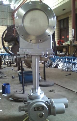 PZ973H、PZ973F、PZ973Y 电动刀型闸阀(刀闸阀):电动驱动、对夹式连接、明杆平行式刚性单闸板,阀座密封面为硬质合金与聚四氟乙烯,公称压力 PN10~16,阀体材料为碳素钢(PZ673H-10C~16C)、不锈钢(PZ673F-10P~16P PZ673Y-10P~16P),具有排渣功能的的闸阀。