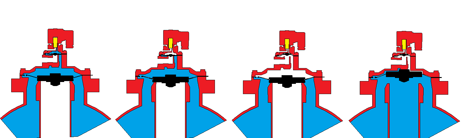 利用膜片上的节流孔平衡压力形成密封,气包内的压缩气体可以通过节流孔到达膜片的上方腔体,由于存在受压面积差,造成压力差,使膜片的密封面紧紧压在阀体密封座上,形成密封。当需要工作时,电磁线圈驱动动铁芯工作,打开泄气孔,破坏压力平衡,膜片被气体推开,脉冲阀被打开。绕线线圈通电后产生磁场力,磁力克服动铁芯所受的气体压力、弹簧力及自重,把动铁芯吸合,动铁芯吸合后小膜片上方腔体与脉冲阀外部联通,上方气体迅速排出,小膜片上节流孔补气速度低于泄气速度,故小膜片被气压推开,这样大膜片上方腔体与外部被联通,内部气体瞬间排出,大膜片的节流孔补气速度低于排气速度,故压力降低,膜片下部压力大于上部压力,迅速把大膜片推开,这样脉冲阀就比开启,形成瞬间喷吹。当电信号关闭后,绕线线圈失电,磁场里消失,动铁芯在弹簧力的作用下复位,气压迅速建立并密封,关闭了小膜片上方腔体与外部的联通,压缩气体通过节流孔迅速进入小膜片上方,压力恢复并密封,同理大膜片关闭密封,脉冲阀关闭。