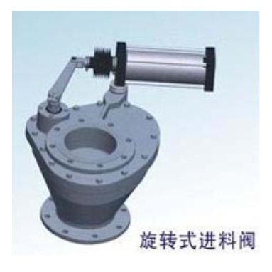 进料阀设置于发送器顶部,用于发送器的进料进行控制。其工作原理是由外部气缸带动轴作900回转,从而带动法兰盘,当法兰盘向上时,即关闭进料阀;当法兰盘向下时,即打开进料阀。密封是依靠固定在阀体上密封图(1)和固定在法兰盘密封圈(2)的紧密接触为实现的。