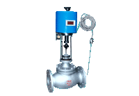 工作前主阀芯处于半开位置,传感器处于自然状态。接上电源,主阀芯全开。介质由箭头方向流入主阀体、经阀芯对储热箱进行加热。当温度升到相应设定值时,传感器即产生相应线性信号输入一体化智能执行机构,随即驱动阀杆、阀芯产生位移,关闭主阀芯停止加热。当温度低于设定值时,传感器即产生线性信号输入执行机构,驱动阀芯渐开,使介质按抛物线特性流入储热箱,进行加热直至设定值。这样被控介质始终在设定温度范围内被控制,从而达到控温目的。