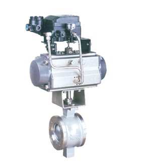 气动V型调节球阀是我公司新开发的硬密封、四氟密封调节球阀。它采用板簧加载的可动阀座结构,阀座与球体不会产生卡阻或脱离等问题,密封可靠,使用寿命长。该气动球阀阀芯设计成带有特殊开关的V型缺口,流通能力大,压力损失小,并具有精确的截流特性和控制功能,流量特性为近似等百分比。启闭件采用V型球缺结构,完全解决了阀腔易沉积介质的问题。