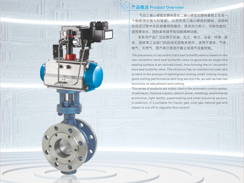 气动三偏心硬密封蝶阀是在二偏心硬密封蝶阀基础上生成一 个角度(密封面为斜锥面),从而形成三偏心硬密封蝶阀。该结构 在启闭过程中无机械磨损和擦伤,其关闭力矩小、切断性能好、 使用寿命长,同时具有调节和切断两种功能。 本系列产品广泛应用于石油、化工、电力、冶金、环保、轻 纺、造纸等工业部门的自动化控制系统中。适用于液体、气体、 煤气、天然气、蒸汽等介质进行截止或调节流量控制。