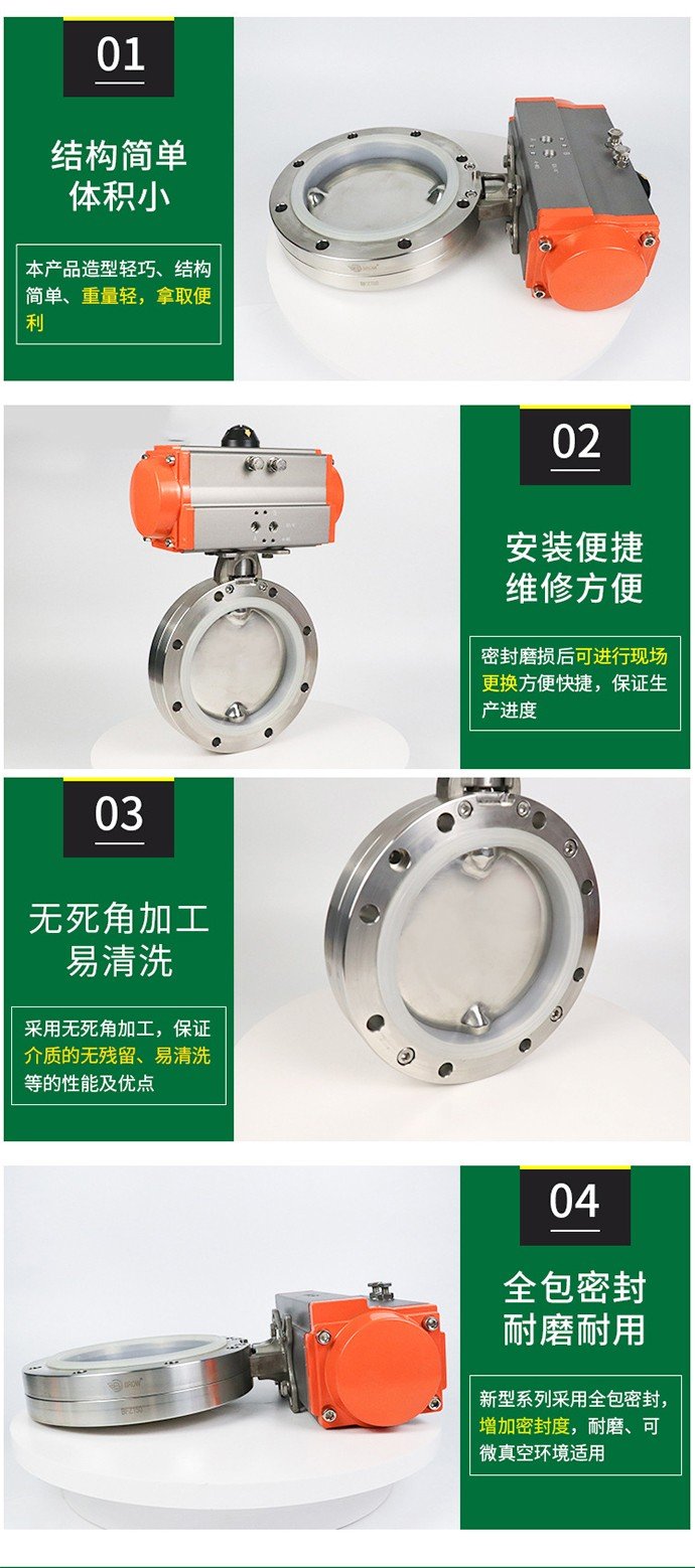 本公司生产的BFZ粉体真空蝶阀,产品材质采用不锈钢304/316L,具有重量轻、体积小、设备维护简单等特点,是一种性价比极高的气动蝶阀。产品压力0.4MPA,旋转90°开闭方便迅速,适用温度120℃内。密封形式可以采用内衬型和全包内衬型,材质采用优质硅胶、氟橡胶。连接方式可以分为法兰式和对夹式,控制方式为开关型和调节型二种。亦可以依据工况需求,配备不同的驱动设备,如手动,电动,气动。满足不同的控制要求,起到长途开关堵截或调理流量巨细等作用。广泛使用于水、气、油品、粉体等粉体介质的使用场合,可以推广应用于制药、食品、啤酒乳业、生物工程、精细化工等行业.