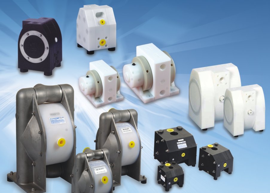 ● Almatec A型:全PE和全欣氟龙气动双隔膜泵,适合于高污染、低噪音场合,并有导电型式机种可供选用。