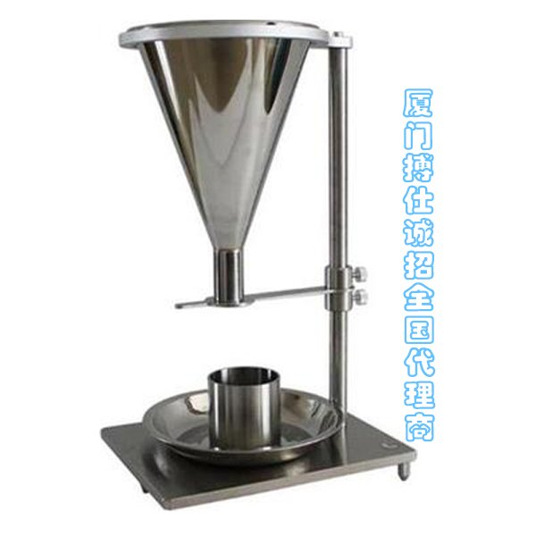 工作原理:将待测的微粉装入漏斗,微粉在自身的堆积作用下处于堆积状态。当电磁振荡器启动后,微粉在电磁振动的作用下,途径流入测量桶中,将落入到测量筒中的微粉刮平,在天平上称取刮平后测量筒中的微粉质量,再除以测量筒的容积,就可以测出待测微粉的堆积密度