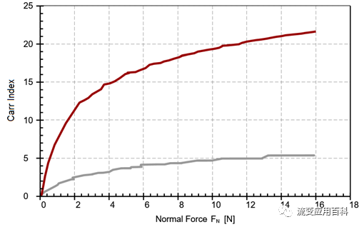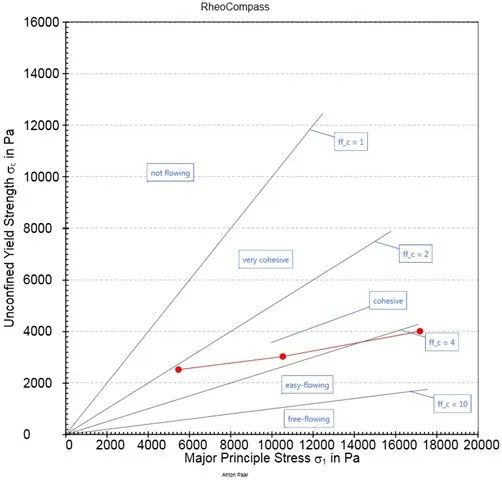 粉体和颗粒介质几乎可以在任何行业都在使用,它们作为原材料、中间产品或*终产品进行使用和加工。粉体在使用过程中可能会造成一些困难,因此,有效的质量控制和顺利的粉体加工非常重要。粉体行为特性在制造过程中可以改变,特别是当条件或环境改变时,例如粉体在气动输送过程中流态化,在储存过程中固结。当粉体特性已知时,**对工艺条件进行修改适应,以便在加工过程中不会出现问题(例如分层)。 Anton Paar公司的两个粉体测量池(粉体流动池和粉体剪切池)为此提供了一套完整的工具,可以确定各种粉体特性和加工参数。这套工具有助于描述粉体的特性,以及预测粉体在加工、处理和储存过程中的行为。软件中提供了多种专用的粉体测量方法,大多数只需几分钟即可完成。 虽然这两个测量单元在应用和技术上有一定程度的重叠,但它们的专业领域可以根据所涉及的粉体的粘性来划分:粘性粉体在粉体剪切池中工作得更好,而自由流动状态的样品在粉体流动池中工作得更好。下图显示了不同状态粉体适用的测试方法和测量池。 在本应用报告中,展示和讨论了表征粉体和颗粒介质的各种方法和相应的参数。可在Anton Paar粉体流动池进行的测试方法概述见表1,表2显示了粉体剪切池方法的概述。Anton Paar联合一些大学和研究实验室正在不断开发出更多的实验方法,**进展可在我们网站上的科学出版物和其他应用报告中找到。表 流动池的测量功能 1、动态流动测量 Anton Paar模块化紧凑型流变仪系列(MCR)可配备粉体流动池和螺旋双叶测量系统,该测量系统可用于扩展粉体的动态测量和测定其运动特性。通过测量系统在粉体样品中的向上和向下运动计算动态流动特性。如基本流动能(BFE)、稳定性指数(SI)、流速指数(FRI)和比流动能(SE)。 该测量方法分析了整个粉体床上粉体的动态特性。测量转子动态上下运动,从而根据粉体的阻力建立特定的流动模式。样品的流动模式取决于主要的内部和外部参数。因此,动态流动特性的测定是一种快速简便的粉体质量控制工具。 动态流动测量示意图,左:测量系统在样品池中一边旋转一边上下移动,右:同时记录扭矩和法向力的数值变化 总流动能通过测量扭矩的积分加上法向力(下式)计算得出,考虑了测量系统轴向和径向运动的总和,其中r为转子半径,α为螺旋桨角度,h为行程。 2. 压降测量 了解用于输送的起始流化和全流化的气体流速对于气动输送水泥、食品粉、粉煤灰、洗衣粉、油漆粉、塑料和金属粉很有意义。样品制备所用的气体流动速率在内聚强度测量、透气性测量和流动曲线测量中非常有用。 测量一般包括两个步骤。首先,空气流量从**值持续减小到*小值,这个过程中可以研究全流化率。在第二步中,空气流量不断增加,这个过程可以测量粉体的初始流化和全流化时的空气流动速率,以及粉体的滞后行为。 为了简单起见,下图中只显示了空气流量增加的部分(红色)。通过在控制单元上执行相同的测量,考虑系统(多孔烧结玻璃、过滤器等)的影响是至关重要的。 该基线(上图中的灰色线)必须从样品的测量值中减去,结果图如下图所示。测量池内的压力随着体积流量的增加而增加,因为颗粒对流态化空气产生的反压力增加。一旦达到一定的体积流量(取决于颗粒特性),就可以检测到粉体流化和曲线峰值。在这种情况下,可以在0.75l/min的流速下看到初始流化的过冲峰值,在完全流化时,观察到恒定压力信号,这意味着粉体在1l/min下完全流化。此时,颗粒之间的残余张力被消除。 3. 内聚强度测量 内聚强度描述了粉体流动的内部阻力,从而衡量粉体的流动性。它被定义为测量粉体颗粒之间结合力的强度。粘结强度测量速度快,重复性高,有助于预测粉体行为的质量控制工具。 这种测量方法可以作为一种快速简单的质量控制工具,因为它通常具有很高的重复性,有助于区分甚至非常相似的粉体。 测量由两步组成: 样品制备:样品完全流态化,以重置粉体并消除残余张力和结块。必要的体积流量应事先用压降法确定。 样品测量:关闭气流,测量双叶搅拌器的旋转扭矩,如下图所示。默认情况下,测量在100秒后结束。 内聚强度S是用测量的扭矩值和转子的特性系数(CSS系数)计算的,因此,计算的结果是相对值。计算结果显示在公式1中扭矩值是通过对过去20个数据点的线性回归得到的(见图5)。对于CSS因子,用碳酸钙(CRM116,标准物质局)进行了校准测量。 4. Warren-Spring内聚强度 此方法用于测量粉体的内聚强度,特别是强粘结性的粉体(如面粉或水泥)它是基于Geldart的工作,通过使用一种叫做the Warren- Spring-Bradford测试仪的扭转装置进行研究,粉体在固结状态下测量,固结也使粉体均匀化。所得结果可用于分析粘结粉体的流动性和流动函数,该方法也可用于粉体结块的研究。 此方法可用于质量控制、粉体特性表征(固结状态下的弹性、内聚强度)、流动性分析(ffc)和结块行为研究。*适用于粘性粉体,如面粉、二氧化钛或碳酸钙,但通常适用于除*自由流动的粉体外的所有粉体。 测试包括两步: 粉体在粉体流动池中用透气活塞固结,通过消除残余张力和颗粒之间的聚集形成均匀的粉体层。 Warren-Spring转子完全插入粉体样品中,然后将粉体以0.1转/分的速度剪切,同时记录扭矩,从而产生Warren-Spring内聚强度。 如果Warren-Spring转子不能完全插入样品,建议降