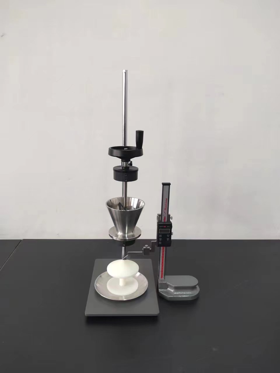 仪器主要由不锈钢漏斗、测量平台、升降操作台、测量杆、测量臂、304不锈钢底盘、数显模块等组成。