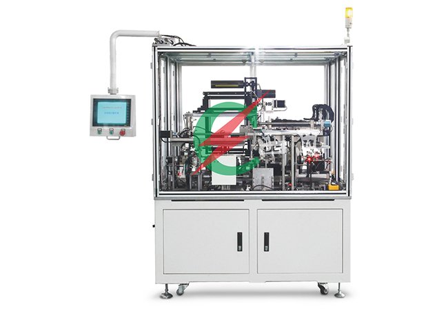 设备操作流程:人工放正负极片至正负极上料盘,安装好隔膜至叠片台上,按触摸屏启动自动运行。隔膜先压在叠片台上,先叠负极至叠片台隔膜上,叠片台移动一个工位(隔膜在两个工位中间),再叠正极至叠片台隔膜上,如此循环叠片至需要极片数量,叠片完毕后由机械手夹出包隔膜,包膜完毕后切断隔膜,机械手夹出贴胶,贴胶完毕后自动出料至短路测试机构,测短路后报警提示是否NJ,机械手拿出电芯分选良品与非良品放置在收料盘上(摆放时极耳方向来分辨良品与非良品)。