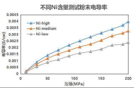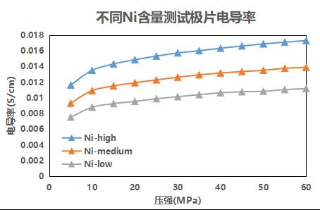 调整三元材料中的Ni含量,测试粉末电导率可发现:随着Ni含量的增加,粉末电导率增加;对比三种不同Ni含量的三元极片,同样可得到随着Ni含量的增加,极片电导率增加;由此可见,粉末电导率和极片电导率有相同的趋势。