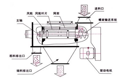 物料由料斗经螺旋输送进入筛箱,分流叶片连续转动,形成了物料在筛箱内不断的更新推进,使物料产生运动冲向筛网,细料通过筛网落入成品仓,粗料继续向前,在粗料口爬出,从而达到理想的筛分效果。