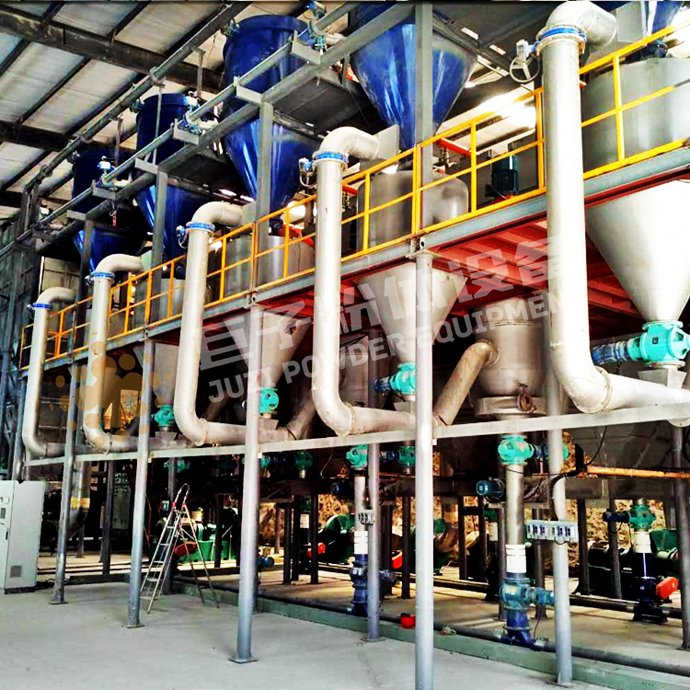 6、细粉的收集采用与分级机分开安装的旋风筒和袋收尘(或电收尘)设备,收集效率高,可以避免粒径很小的微粉再返入分级机。