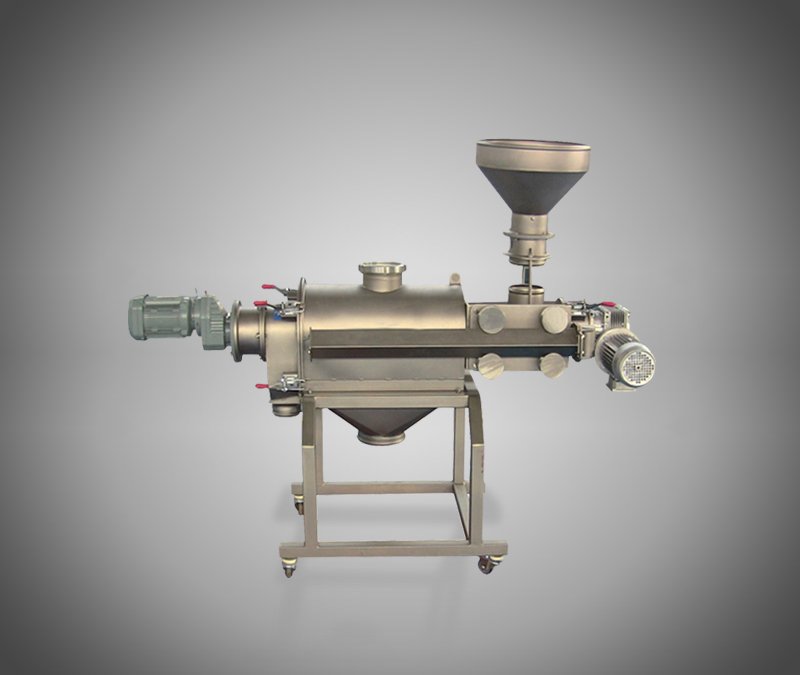 气流筛分机备筛网为圆筒状,置于机体内,物料通过螺旋输送系统后,和气流混合、雾化进入网筒内;通过网筒内风轮叶片使物料同时受离心力和旋风推进力,从而近使物料喷射过网,由细料排口排出,不能过网的物料沿网筒壁从粗料排口排出。