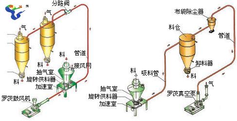 风机在气力输送中的作用 气力输送技术广泛应用于石油、化工、冶金、食品、建材等部门。近年来,气力输送在火力发电厂粉煤灰、化工粉体、颗粒料、精细化工的原材料、水泥、原粮等输送工程中已得到了广泛的应用。具有能耗低、自动化程度高、可长期连续运行、无环境污染等诸多优点,是*适合散料输送的一种先进的技术, 气力输送系统设备主要有风机、压缩机、旋转加料器、换向阀、滑板阀、旋风分离器、仪表等. 风机在气力输送中是起到提供气源的作用,而气源设备在气力输送系统中处于核心的地位,是*为重要的设备。它提供的输送风量和压力有力的保证了系统的有效性和可靠性。由于气力输送的方式、使用场所、输送距离和所需输送的容量,以及被输送物料的物性均不同,故可选择的气力输送系统的气源设备的压缩机,有多种类型,常用的有空气压缩机、罗茨鼓风机、罗茨真空泵、离心风机等。以下是常用的气源类型 卧 式、水平对向式、往复式、立 式、容积式、V型式、回转式、罗茨型、多叶式、空气动力式、轴流式、液封型、离心式、喷射器式 有关气力输送系统的设计需要确认所需气体的流量和压力,是正压还是负压,以保证输送的可靠和有效。 气力输送系统可分为两种不同的流动形式:1、稀相输送(料气比小于10)2、密相输送(料气比大于10);稀相输送可以被认为完全的悬浮流,而密相输送通常被认为是非悬浮流,而我们的罗茨风机一般都应用在稀相系统中比较多。 稀相气力输送系统用的*多的气源是离心通风机和罗茨风机,特别罗茨风机在低、中压气力输送时一般有两种布置方式:1、压送式气力输送气源布置;2、吸送式气力输送系统气源布置。罗茨鼓风机的优点是:结构紧凑、管理简便、风压较大、效率较高,从其特性曲线可见:其风量随压力变化是硬性的,尤其适用于气力输送的工况,并显著地表现出其流量的稳定性。 在设计低压气力输送装置时,首先应从用户处按装置设置的目的,将被输送的物料、输送量和输送的距离(水平、垂直、相当90度的弯管数量等。系统的配置走向可事先做出多种方案进行比较后选择)等主要技术参数确定下来。此外,作为设计计算的原始资料,还应包括以下内容,以使装置系统的设备费和运营费为*低,且同时具有较高的可靠性和耐久性。 1、 物料的料性; 2、 输送能力(包括昼夜总输送能力、供料变动率、**和*小的瞬时输送量); 3、 连续工作时间; 4、 许用的中间停止时间; 5、 输送装置前后工艺设备的连接情况; 6、 安装地点的情况; 7、 管路布置的具体情况; 8、 电源条件; 9、 对环境噪声、粉尘的排放等的限制性要求; 10、装置运转管理条件,应考虑是否自动化控制、遥控、系统连锁和监视等。 高压式气力输送 输送机理:在气力输送技术出现后的相当长的一段时间内,几乎都是悬浮流的低压稀相输送(吸送和压送),由于散状粉粒料为高速气流带走,料粒相互间及其同管壁的碰撞使管道磨损,且料粒破损不可避免,加之输送用空气量大,因而能耗也大。虽然降低输送气流速度可以有所改善,但又极易引起管道堵塞,这种情况曾经阻碍了这门技术的扩大应用。 气力输送装置采用高压空气的主要原因是:首先,要求降低输送物料的能耗;其次,使超过1000M以上距离输送散料成为可能(运用1、双套管管道技术;2、使用中间增压排气装置;3、管道变径放大技术);第三、用来处理难对付的脆性物料