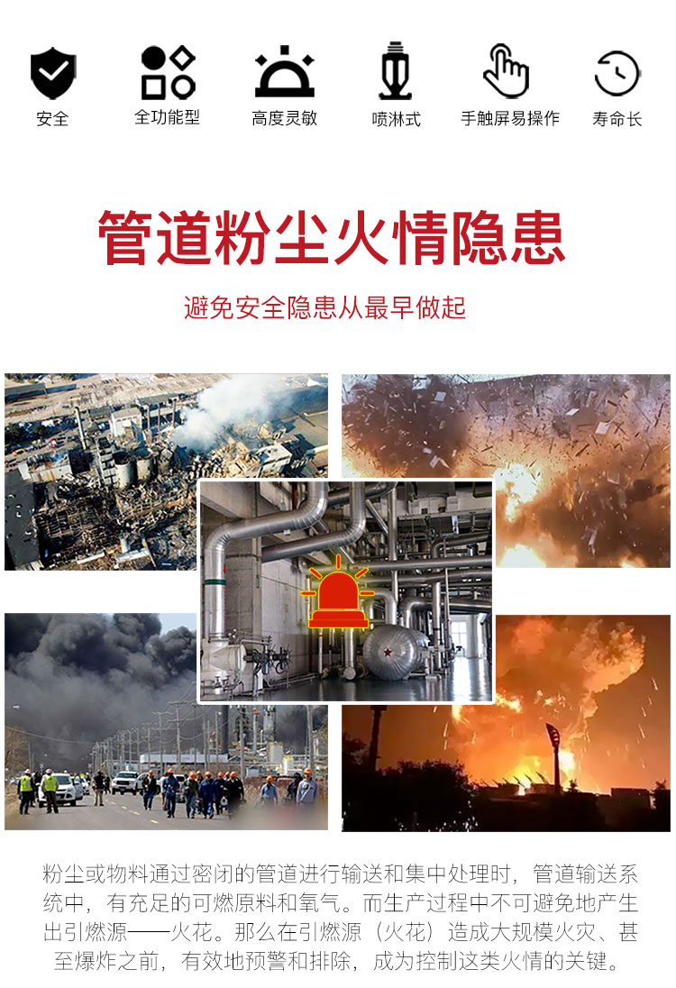 现行木材、金属、化工、锅炉、家具厂、门窗厂、人造板、纺织厂等中,随着对环保要求的提高,越来越多的粉尘或物料通过密闭的管道进行输送和集中处理。这样的处理方式极大地提高了环境质量,加强了集中处理的工艺能力,但同时也引发出新的安全隐患。在这样的 管道输送系统中,有充足的可燃原料和氧气。而生产过程中不可避免地产生出引燃源——火花。那么在引燃源(火花)造成大规模火灾、甚至爆炸之前,有效地预警和排除,成为控制这类火情的关键。