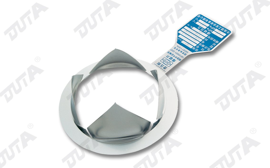 平板带槽型爆破片是在圆形金属膜片的一侧加工“十字”形或环形减弱槽。当达到爆破压力时,爆破片沿该减弱槽破裂。当PC型爆破片直接夹在法兰之间时,爆破片两面应粘接密封垫。