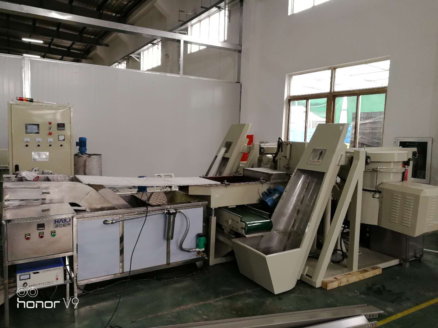 整台设备的加工流程,物料(包括工件与磨料)先从外部人工把工件与磨料添加到加料斗中。然后加料斗把磨料与工件添加进入到涡流式光饰机中。添加好后,自动开始加水、加磨液(可调流量)。然后进行光饰,光饰完成后,从光饰机中倒出进入到中间振动料斗中。然后从中间振动料斗(可调节出料速度)中缓慢进入的振动分选筛(振动频率可调),把加工好的工件与磨料分离开来。接下来,工件从振动分选筛的出口出去,而磨料则通过回料输送带都从振动分选筛中重新回到加料斗中,然后再添加至光饰机中,再接着进行下一个循环。以上过程是作为自动化单机的整体循环过程,作为进一步发展,本系统把2台光饰机并联起来,两个光饰机共用1套中间料斗及振动分选筛。当其中一台涡流式光饰机在分选时,另外一台光饰机在光饰,通过这种方式,使辅助时间减少到*少,生产效率得到提高。共用一套中间料斗及分选系统,节省了成本,另外占地面积也大大减小。