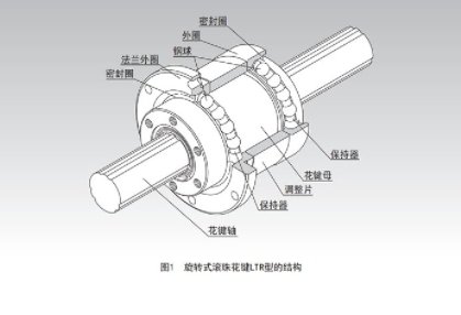旋转式滚珠花键LTR型是在花键轴外圈上设有3条突起部,并配有2列(总共6列)负荷钢球列分别从左右方将其夹住,可很容易施加预压。在花键母外径上设置了角接触型的钢球滚动面,构成支撑轴承,既小型又轻量。各钢球列通过特殊合成树脂保持器,持续进行整列循环运动,所以,即使将花键轴从花键母中抽出,钢球也不会脱落。