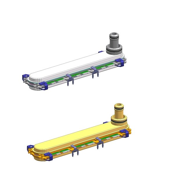 [GBT模块需要承受几百安的电流,每秒开关达到上千次,功耗耗较大。且其与电机、引警等位于空间密闭的汽车前车仓内,热量较为集中如果温度长时间超过其结温,会导致模块烧毁影响整车的运行。大功率IGBT模块的散热大多采用液冷的散热设计。