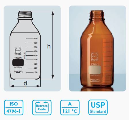 该产品采用易于阅读的刻度尺和宽敞的标签区域,便于轻松标记。材质为烧制而成、极其耐用的白色陶瓷。紫外线防护能力可达约 500 纳米波长。瓶内 DURAN@}特性保持不变,因为着色仅存在于瓶体外表面。得益于创新技术的应用,呈现出非常均匀、耐用且具有化学抗性的琥珀色。