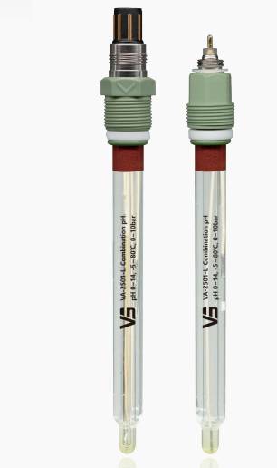 VA-2501-L系列电极,采用强酸碱耐受玻璃敏感膜配方,在强酸碱介质工况条件下实现长期寿命的同时,对于强碱/高钠溶液之pH值测量更加精确。聚合胶参比电解质(果冻胶体),耐高温能力强,介质交换速率慢,使用寿命长。