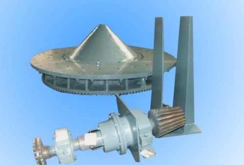 圆盘岀灰机是石灰竖窑中主要设备之一,在石灰生产中,岀灰的过程对成品灰的质量和产量非常重要。我公司结合国内石灰窑的生产状况,引进国外技术开发研制的YPCHJ系列圆盘岀灰机岀灰时炉内料柱均匀下降,料面不偏斜,并且在岀灰过程中不破损块状石灰,能高质量的、准确的全自动化进行生产。经过全国几十座炉窑长期使用,性能稳定,运转良好,受到用户一致好评,见附图,该产品主要由电动机,减速器,传动轴,转盘,刮刀等件组成。
