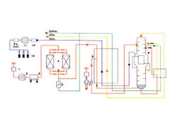 本设备采用低压流程,利用深度及精馏的方法从空气中提纯氧合纯氮,即利用透平膨胀机的冷冻循环原理使空气液化,根据液氧和液氮的沸点不同,在分馏塔进行二次精馏,从而获得99.6%纯度的氧气及99.99%以上纯度的氮气。根据需要,改变操作亦可制取液氧、液氮和医用氧。