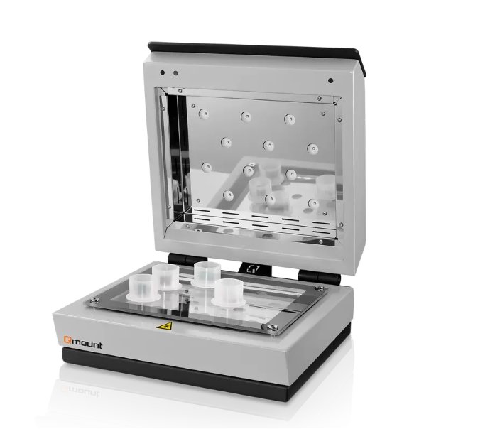 Qmount是一款基于金相样品光固化镶嵌的现代装置。 样品被放置在配有定制的、强大的LED技术的装置中。UV(紫外线)透明镶嵌模具中填充了UV固化树脂。透明的样品可以在很短的时间范围内移开。QATM提供的抽吸装置可以连接到该装置从而提高工作安全性。