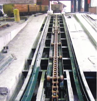 4、爬车爪在链条上应等距离安装,爪间距不得小于l.5倍的矿车长度。