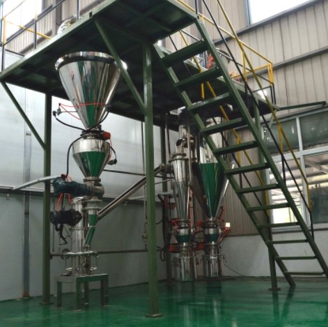 惰性气体保护生产线(如氮气、氦气、二氧化碳等)整套系统在惰性气体保护下实现粉碎、分级,闭环运行。通过改变气源成分,增加相关附配设备,优化密封工艺,为易燃、易爆、易氧化或极易吸潮物料设计定制的粉体加工生产线。可根据物料的不同更换环境气体,系统采用先进的触摸屏,可编程序PLC控制器,实现了全自动控制。氧含量控制容易简单,但其循环使用消耗极小,纯度的误差可控制在1PPM,含量可任意设定。惰性气体保护粉碎系统是采用惰性气体作为超微粉碎实现干式物料的超细粉碎。该系统主要由压缩机、储气罐、料仓、粉碎主机、旋风分离器、捕集器、自动化控制柜等组成。系统开机时首先用惰性气体不断充入系统中将空气惰化,直至全系统达到氧探测仪设定的数值,然后自动启动加料装置将料仓中的原料均匀加入粉碎主机的粉碎室,经压缩的情性气体通过特殊配置的超音速喷嘴向粉碎室高速喷射,物料通过投料口进入柱形粉碎室,被沿着研磨轨做圆周运动的研磨轮碾压、剪切而实现粉碎。被粉碎的物料随上升气流进入分级室,进不了分级轮返回粉碎室继续冲击粉碎,满足要求的细粒子进入分级轮随气流被旋风分离器除尘器收集,惰性气体返回压缩机吸气口,通过压缩机作用,使其气体压缩循环使用。