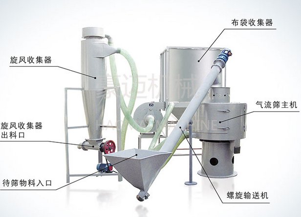 HM系列气流筛分机摈弃重力势能作业原理,采用空气作载体,动能作功的作业原理。通过负压气流将物料与空气混合后,进入筛机风轮中间,通过风轮叶片施加足够的离心力,向桶型筛网喷射过网,经过蜗壳收集。超径物料不能过网,由自动排渣口排出,从而达到快速筛分之目的。