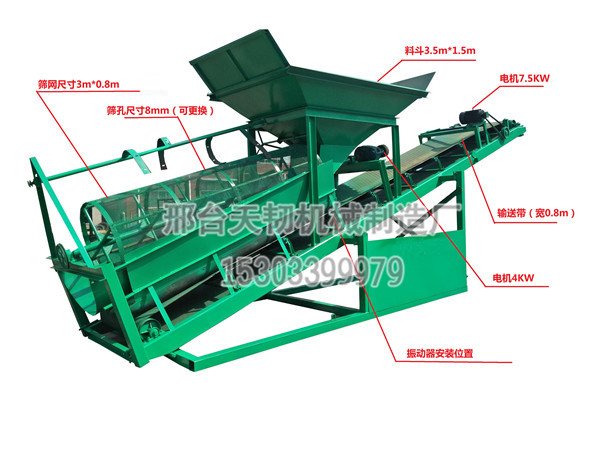 30型筛沙机 外形尺寸:8.2×1.55×2.8m 筛网直径:3×0.8m 筛网尺寸:1.5 料斗尺寸:3.4×1.55m 电机功率:7.5KW 工作效率:60-80立方/小时 输送带宽度:8×0.8m 出沙口离地面高度:3m
