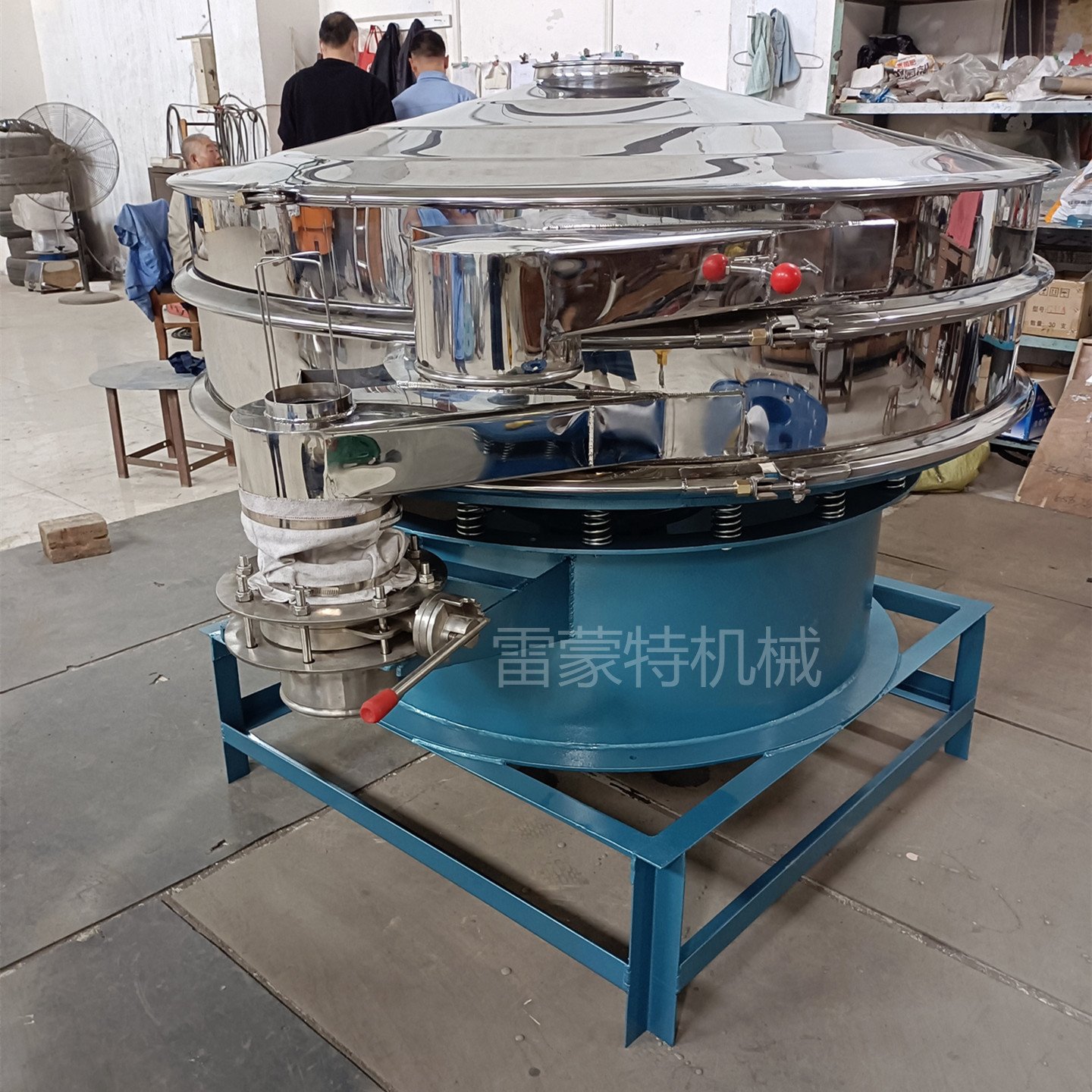 此款筛子是为客户量身定制的一款带卸料控制阀的设备,客户处理物料为电玉粉和其他的化工原料。客户现场人工接料,每接满一袋需要更换新袋继续接,而在换袋子的间隙振动筛仍在继续工作,所以会造成这个间隙时间段物料外溢、铺洒,影响工作环境,现场人员头疼不已。