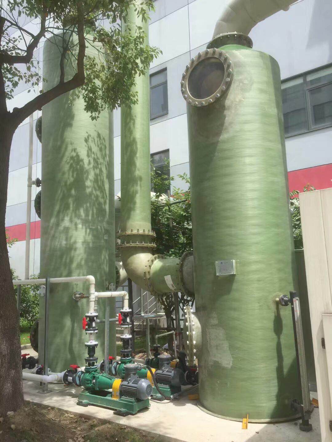 采用冷水机组冷却喷淋塔中的水,使其在合适温度内吸收杂物,同时依靠填料喷淋法进行处理,喷淋塔是利用吸风系统为整个系统气体流动提供动力。吸风机是依靠输入的机械能,提高气体压力并排送气体的机械,它是一种从动的流体机械吸收的原理来达到处理废气的目的。