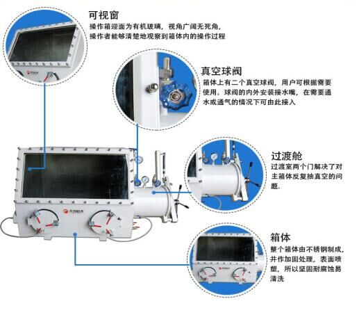 本操作箱主要由主箱体和底座组成,如用户有其它特殊要求,也可以根据需要进行设计或改造;箱体上有二到三个手套操作接口,操作箱迎面为有机玻璃,视角广阔无死角,操作者能够清楚地观察到箱体内的操作过程,使得操作过程较直观地展现在操作者的眼前。箱体上有二个真空球阀,用户可根据需要使用。球阀的内外安装接水嘴,在需要通水或通气的情况下可由此接入。箱体内装了照明灯泡和多孔插座。