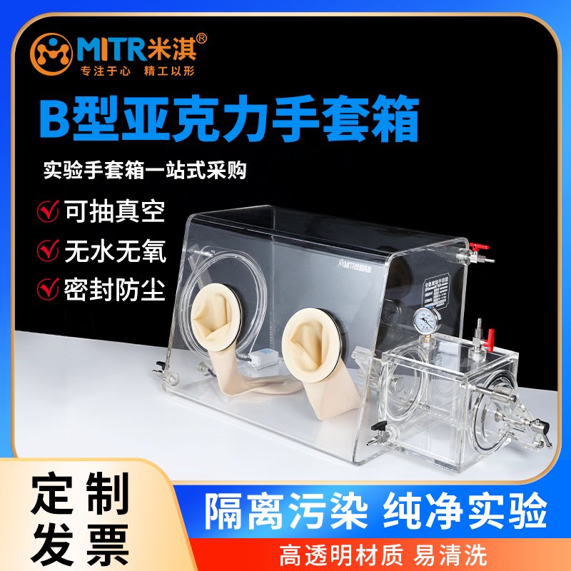 B型手套箱能做简易隔离实验、惰性气体置换实验、防尘实验,紫外线实验、干燥实验等等,通过手套操作箱体内部实验样品。有样品传递窗,可保护箱体内部气体环境不被外界破坏。