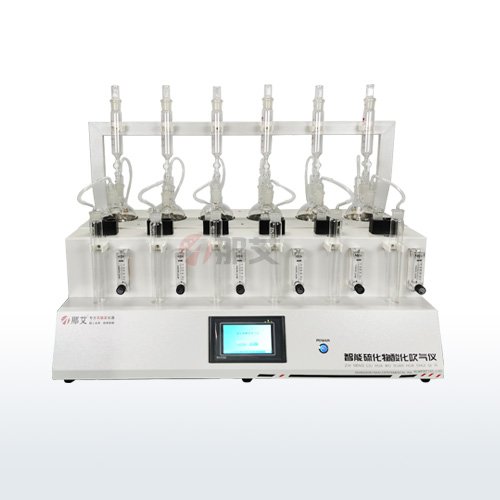 智能硫化物酸化吹气仪是一款根据国家标准《GB/T 16489-1996 水质硫化物的测定 亚甲基兰分光光度法》和《HJ/T 60-2000水质硫化物的测定 碘量法》一款专门用于检测水中硫化物的前处理仪器。该仪器采用垂直加酸、氮气吹脱、酸化吸收等一体化设计,一次可处理1-6组样品。每个单元采用独立的转子流量计控制氮气流速;PID加热控温程序,自动升温至设定温度,缺水自动报警,自动补水,从而大大节约硫化物前处理时间,适合实验室内多个、尤其大批量硫化物样品的测定工作。