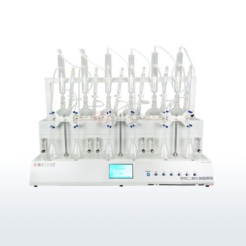 中药二氧化硫残留量检测仪1联/3联/4联/6联系列产品是根据《中国药典》第四部通则2331**法之规定,用于测定经硫磺熏蒸处理过的药材或饮片中二氧化硫的残留量。药典中所提供的检测方法的主要原理是将中药材以蒸馏法进行处理,样品中的亚硫酸盐系列物质加酸处理后转化为二氧化硫后,随氮气流带入到含有双氧水的吸收瓶中,双氧水将其氧化为硫酸根离子,采用酸碱滴定法测定,计算药材及饮片中的二氧化硫残留量。在严格遵循药典要求的基础上,整合加热,蒸馏,氮吹,定时以及滴定等功能为一体,可同时提供3-5个样品(空白样,平行样)的处理,从而极大的提高了检测数据的精度和减少了工作时间。