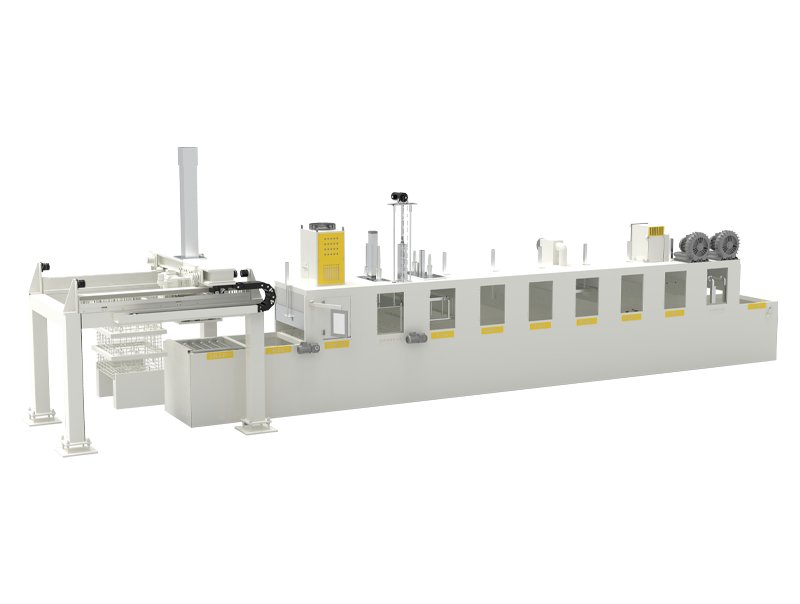 步进通过式清洗机工艺: 自动上料—清洗—隔离工位—凤刀切水—隔离工位—烘干—冷却—阶梯输送—喷涂防锈油—隔离工位—高压风机切油—阶梯输送—下料仓。