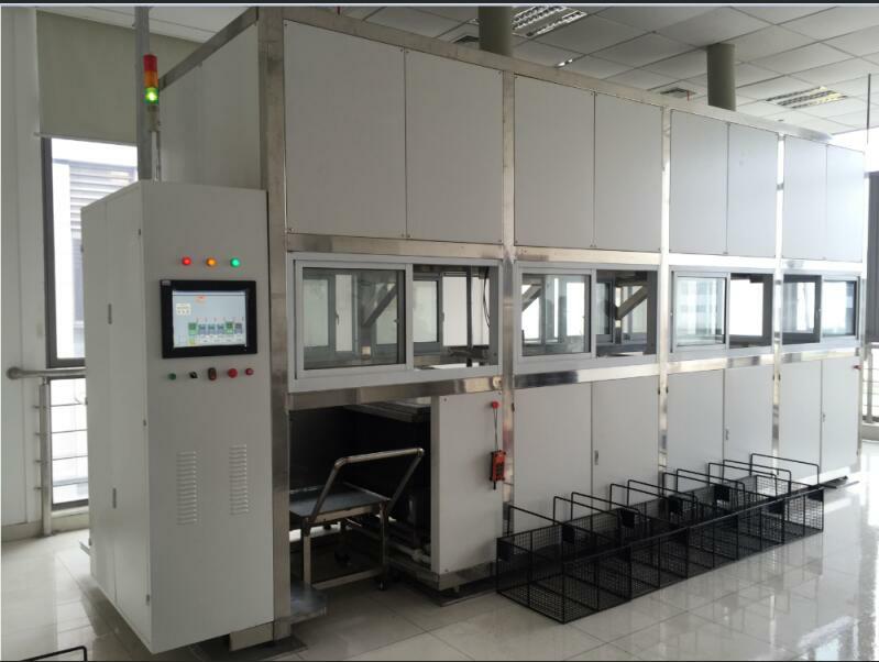 导管自动酸洗设备清洗过程由三菱PLC及工控机控制,设备由6个工位组成;(每个工位具有单独设定时间及任意工位选择功能)分别为1个超声波碱洗槽、1个喷淋槽、1个酸洗槽、1个喷淋槽、1个超声波槽、1个热风干槽及两套上下料推车组成;本机清洗过程为全自动,人工操作简单,只需操作者将装有工件的洗篮放到上料推车工位,单臂机械手自动将洗篮依次送入各工序段,对工件逐次进行超声波碱洗、喷淋漂洗、酸洗、喷淋清洗、超声波清洗、热风干燥等处理后,将处理好的工件自动下放到下料推车上,由人工将其卸下即完成整个清洗过程。每道工序都由PLC自动控制,本设备具有清洗速度快、生产效率高、清洗效果好、环保程度高,使用方便等特点,本设备还具有外形美观,结构合理,使用寿命长,是现代化生产的必备设备之一。