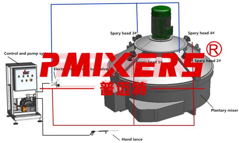 | 该系统由高压泵组、高压电磁阀、高压三维旋转喷头、管路、电控系统等组成。工作时,通过按钮控制系统中高压泵电机启动,高压水通过高压电磁阀依次由布置在搅拌主机上方的三维旋转喷头喷出,达到自动清洗搅拌罐的功能。 |