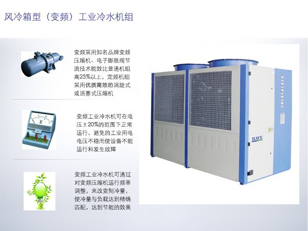 >> 变频工业冷水机采用知名品牌变频压缩机、电子膨胀阀节流技术使之能效比普通机组高25%以上,定频工业冷水机组采用高效涡旋式或活塞式压缩机,电器及制冷系统原器件优质耐用;