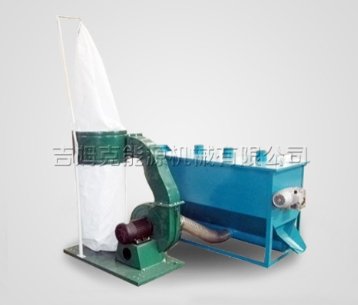 本设备是将颗粒机生产出的颗粒经过进料斗进入滚筒,通过滚筒上的筛网将颗粒和粉尘分离,成型颗粒沿滚筒旋转方向经出料口进入包装袋,而粉尘则通过引风机抽风管道进入除尘袋;引风机同时还对高温颗粒进行冷却降温;在滚筒筛下方有绞龙装置,主要作用是将未进入引风管道的粉尘和残留的非成型颗粒送入引风管道,*终到达除尘袋。