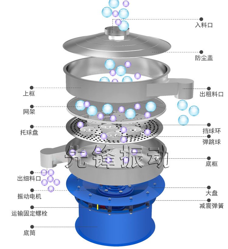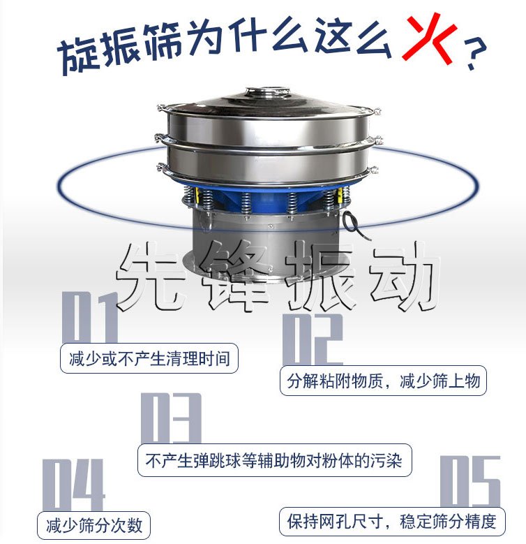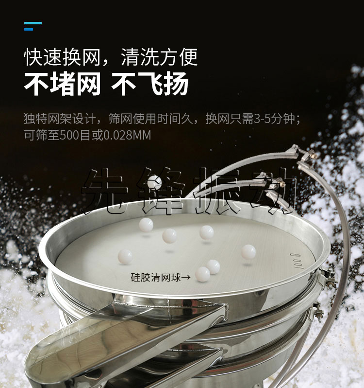 旋振筛是一种细粉筛分机械,其噪音低、,快速换网需3-5分钟,全封闭结构,适用于粒、粉、粘液等物料的筛分过滤。
